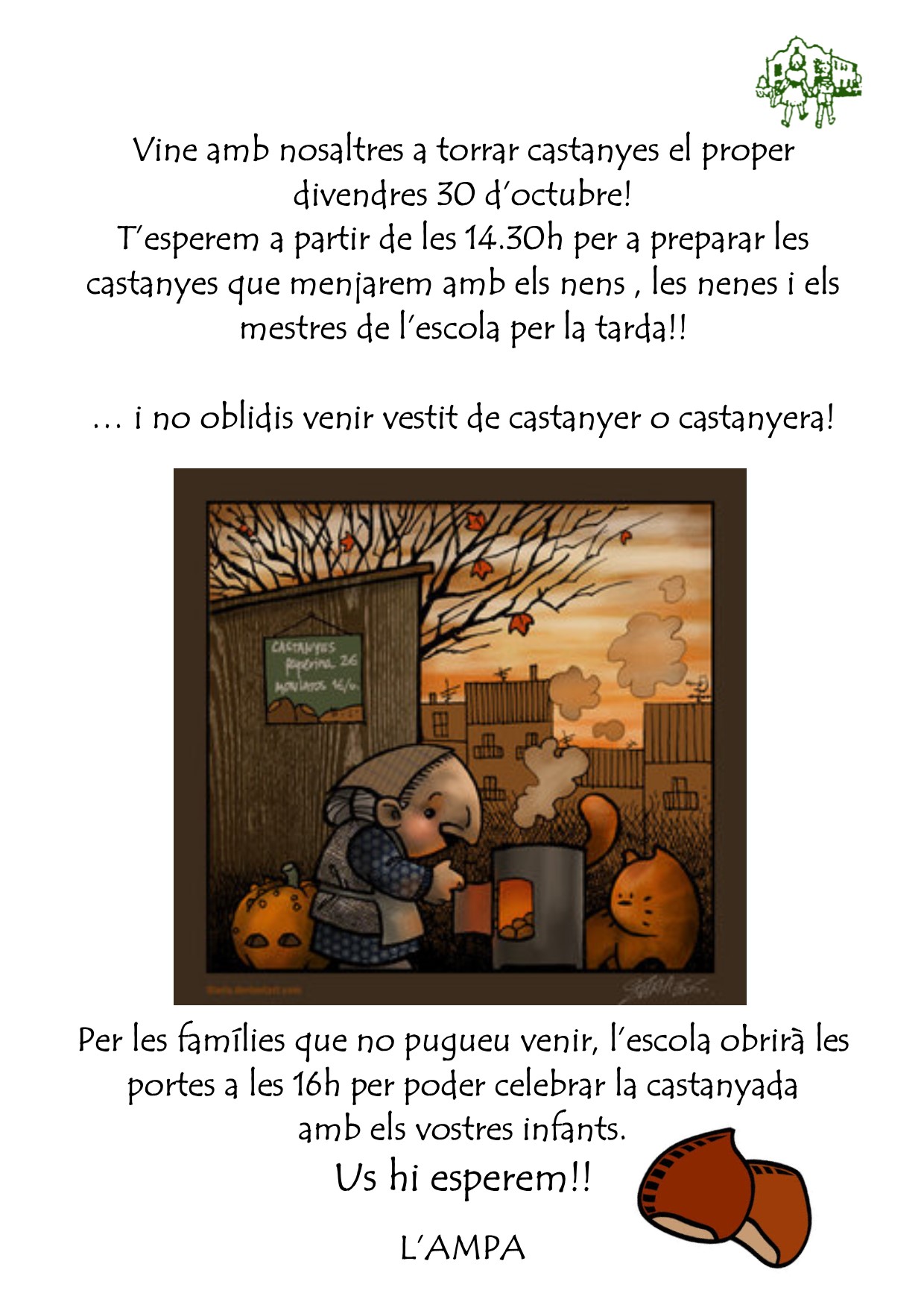 Castanyada 2015 Imatge | 28 Octubre, 20159 gener, 2016 | afagranes vine a torrar castanyes amb nsoaltres el proper divendres a partir de les 14.30h. I si no pots venir, a partir de les 16h l’escola obriarà les portes a totes les famílies per celebrar la castanyada amb els infants. Us hi esperem!! Comparte: Share on X (S'obre en una nova finestra) X Comparteix al Facebook (S'obre en una nova finestra) Facebook M'agrada S'està carregant...