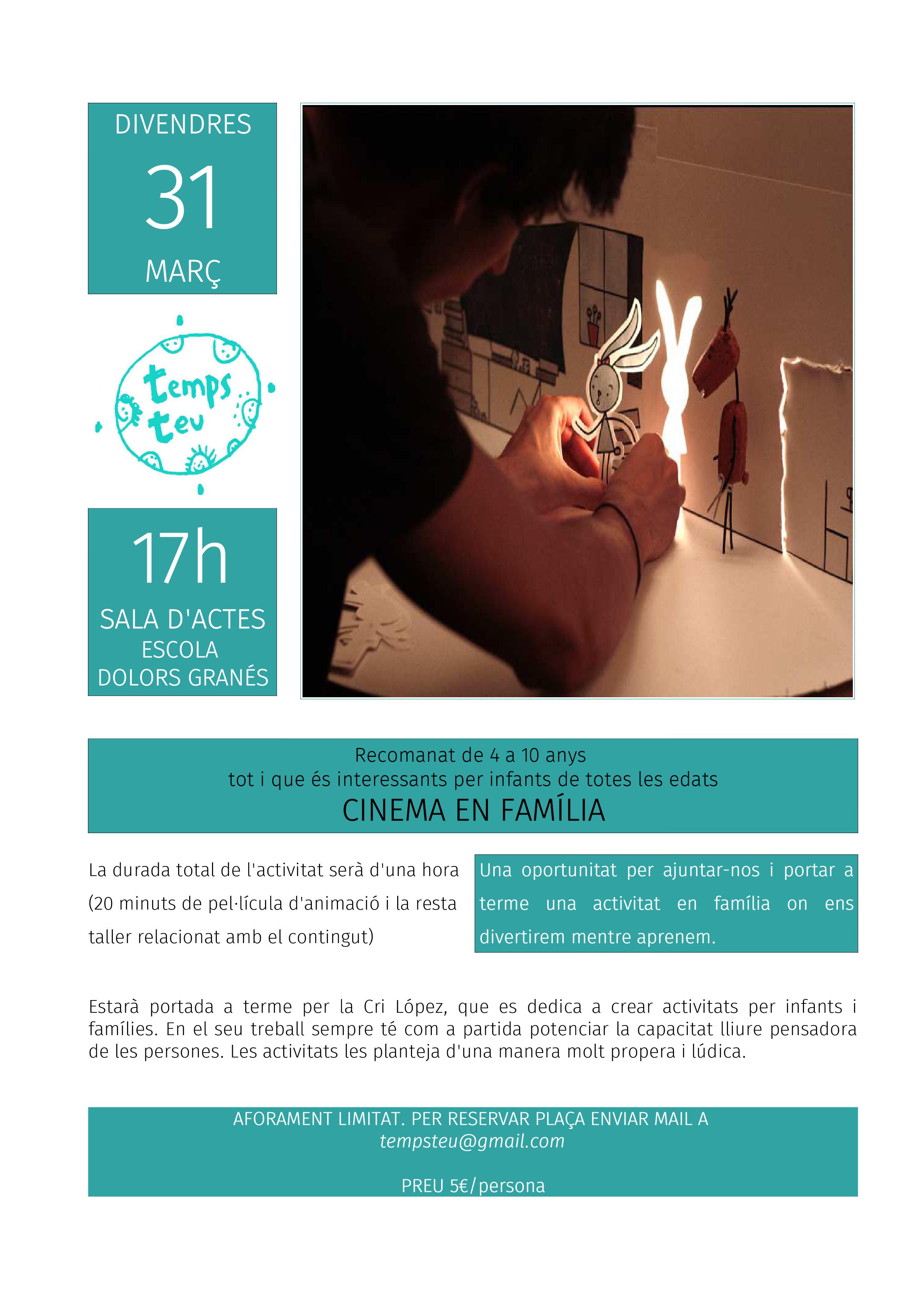 El proper divenders 31 de març, a les 17h, Temps Teu ens proposa un taller de cinema on els infants aprendran, de la mà de la Cri López, com fer un curt d’animació.