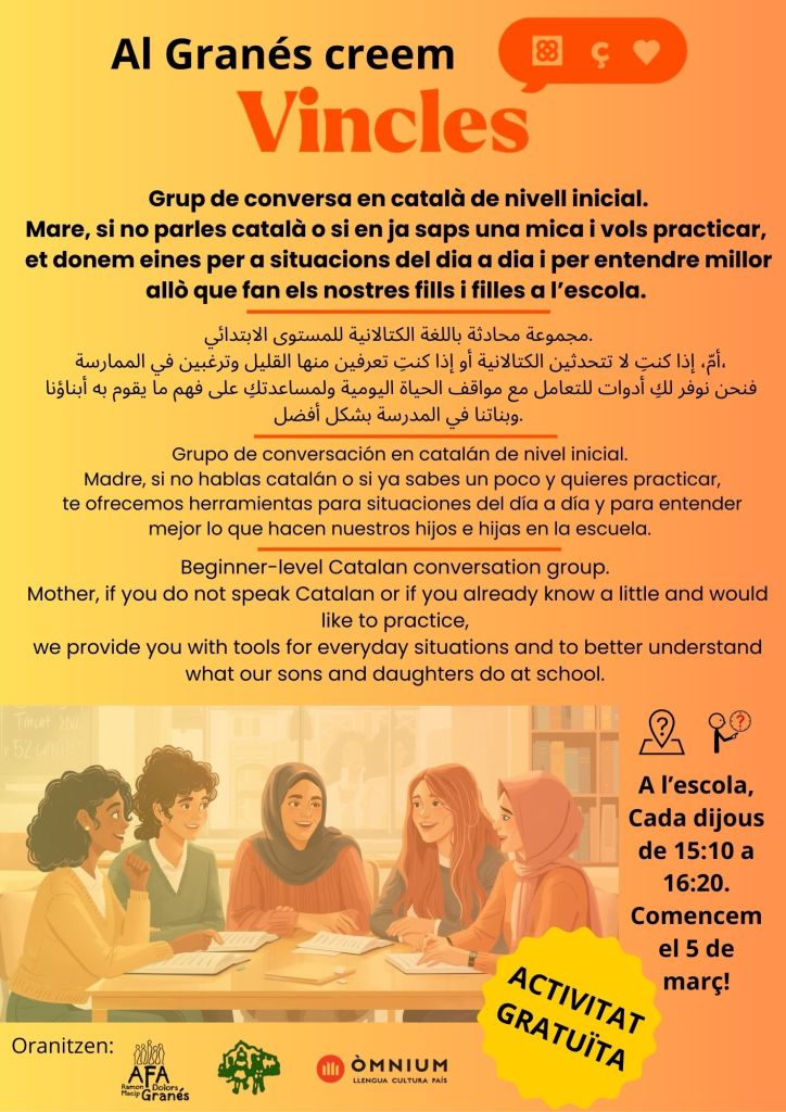 VINCLES-GRANÉS és un espai de conversa informal per a mares que vulguin aprendre o practicar català i fer vincles amb altres mares de l’escola.