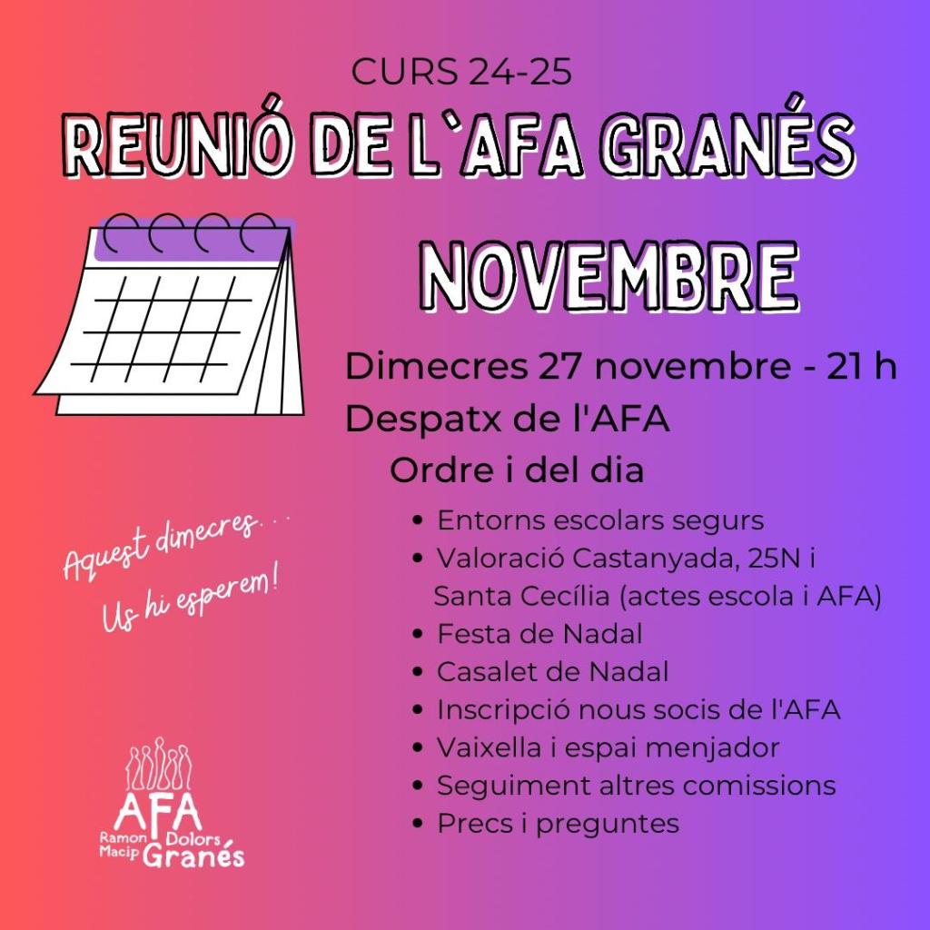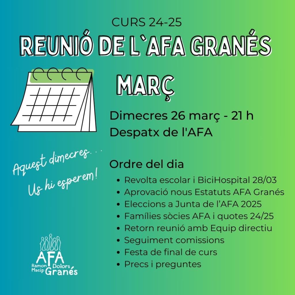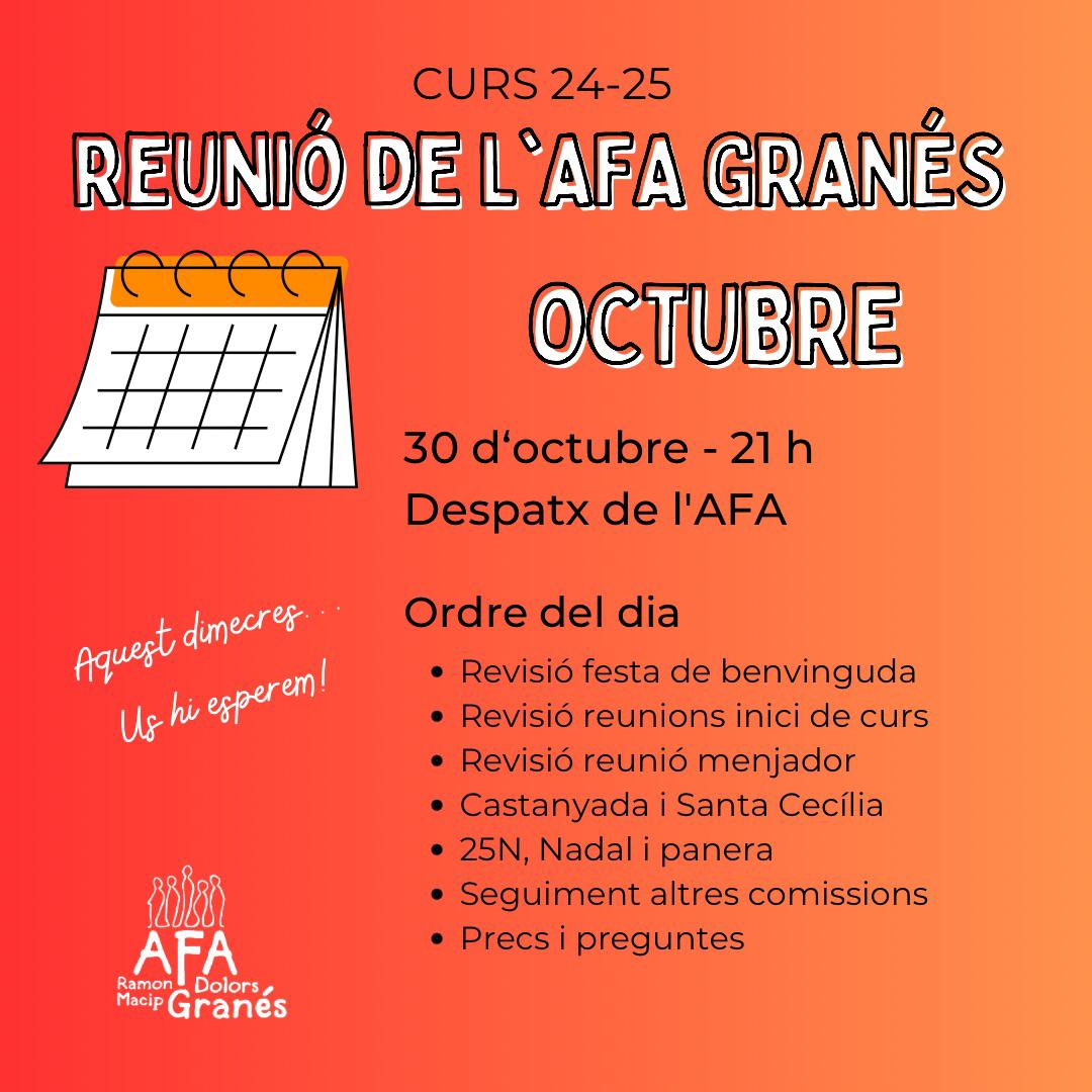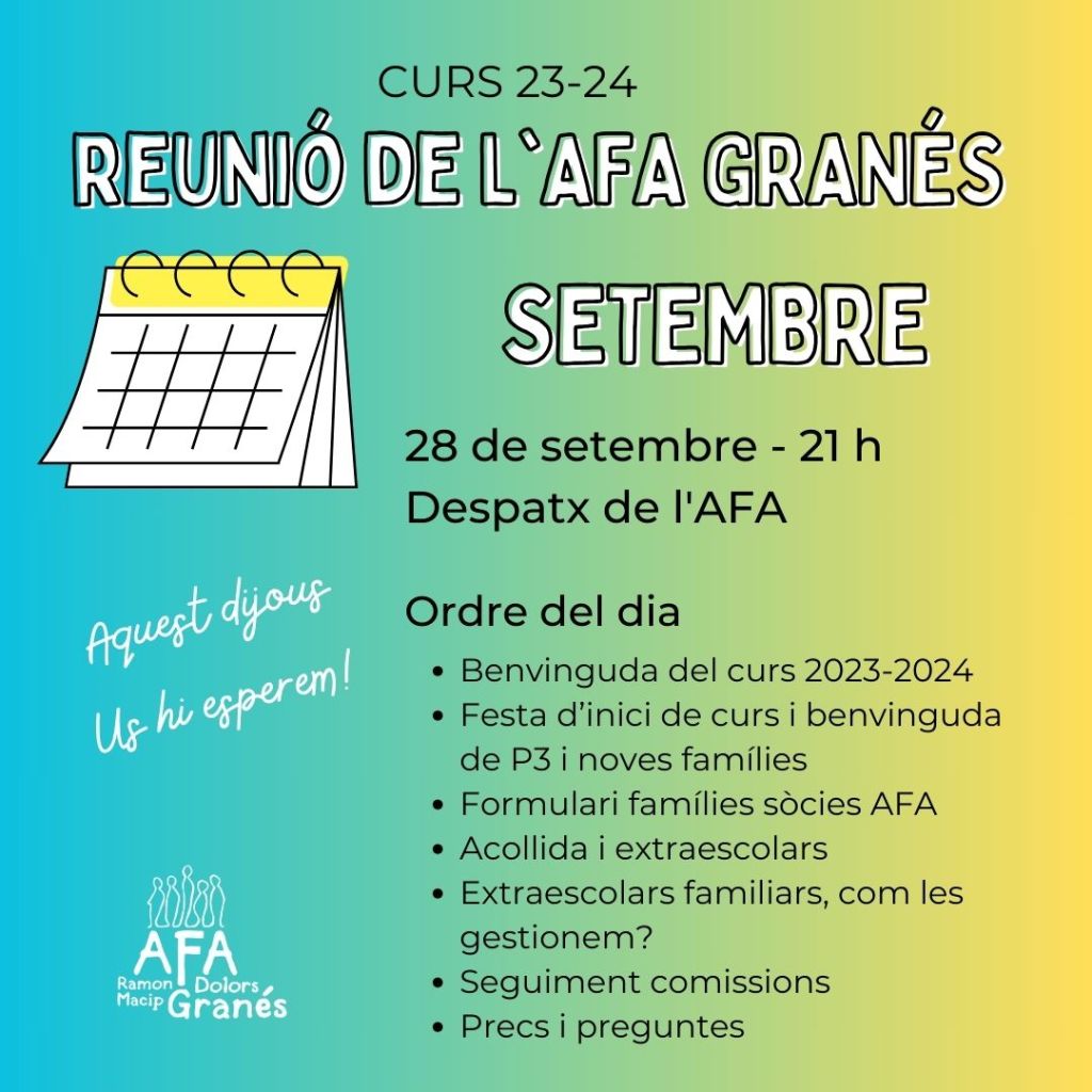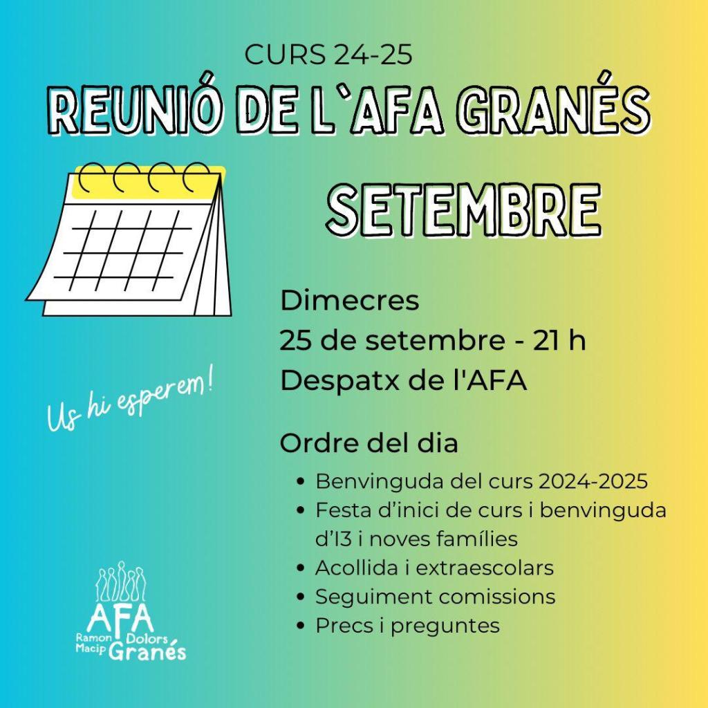 L’AFA de l’escola ens reunim en assemblees ordinàries cada últim dimecres de mes a les 21 h al despatx de l’AFA (al pati de primària). Són reunions obertes a totes les famílies de l’escola que hi vulgueu participar. Anirem informant al respecte i enviant convocatòries.