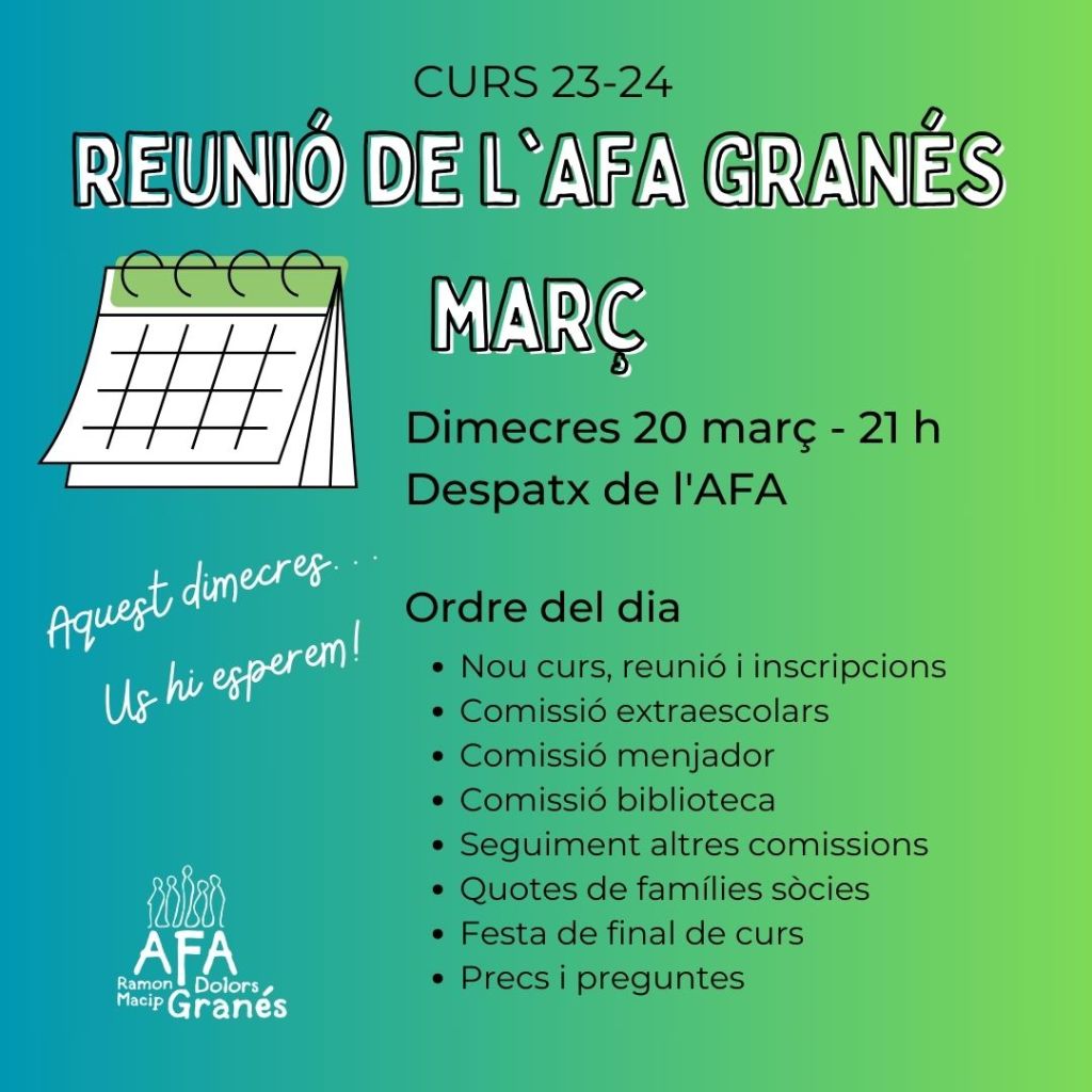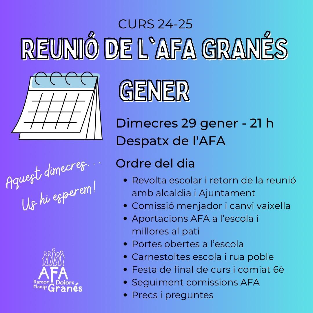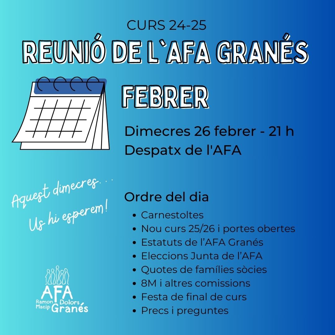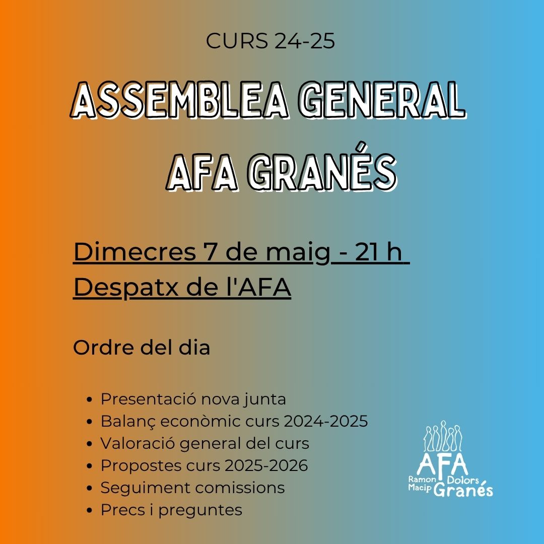 L’AFA de l’escola ens reunim en assemblees ordinàries cada últim dimecres de mes a les 21 h al despatx de l’AFA (al pati de primària). Són reunions obertes a totes les famílies de l’escola que hi vulgueu participar. Anirem informant al respecte i enviant convocatòries.
